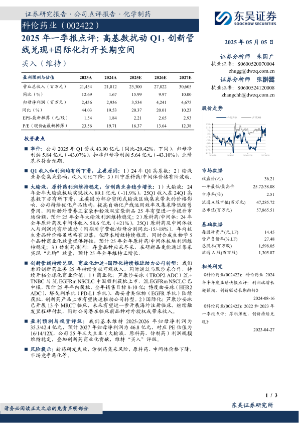 本报告分析了科伦药业2025年一季度的业绩表现,指出短期内公司营收和利润受到高基数、集采以及原料药价格波动等因素的影响,面临一定的压力。但长期来看,创新管线的持续兑现和国际化战略的推进将为公司带来广阔的发展空间。