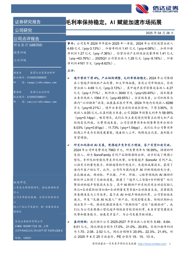 研发加码推动AI发展,便携超声竞争实力增强,客户有望加速突破。2024年公司研发费用达7963万元,研发费用率为16.99%,持续的研发投入,助力SonoFamily系列产品持续推陈出新,逐步形成了便携小型化、专科化和智能化等差异化优势,如智能超声SonoAir系列产品,以强有力的蓄电能力、新颖超薄的外观设计、先进的成像技术,获得了海内外客户的认可。此外,公司作为国内超声AI诊断领域的先行者,在乳腺疾病、颈动脉、甲状腺、产科、肝脏、心脏等领域的AI辅助诊断软件上取得了突破性进展,搭建了“超声人工智能+专科模型”双引擎驱动的超声智能技术生态,其中AI辅助产科系统实现自动追踪胎儿体位+自动获取标准切面+自动测量发育参数+自动报告生成,显著提高筛查精准度与工作效率。基于在AI和超声领域的积累,公司紧贴临床痛点,开发“乳腺AI机器人”新产品,实现影像采集、结构识别和云端决策于一体,推动乳腺癌筛查从“依赖经验”迈向“数据驱动”。我们认为公司在便携小型化超声领域具有较深的积累,未来有望凭借技术优势和服务能力,拓展更多客户,为公司发展贡献动能。