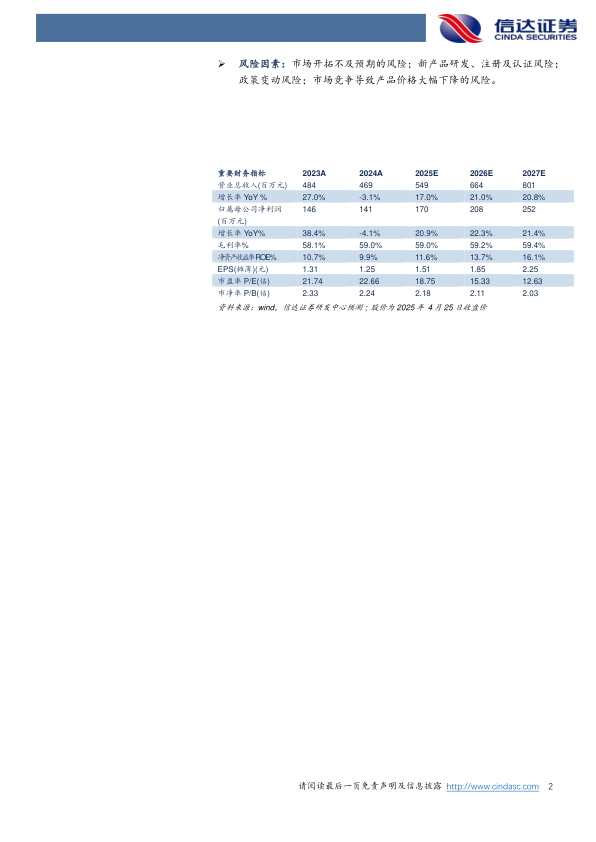 风险因素:市场开拓不及预期的风险;新产品研发、注册及认证风险;政策变动风险;市场竞争导致产品价格大幅下降的风险。