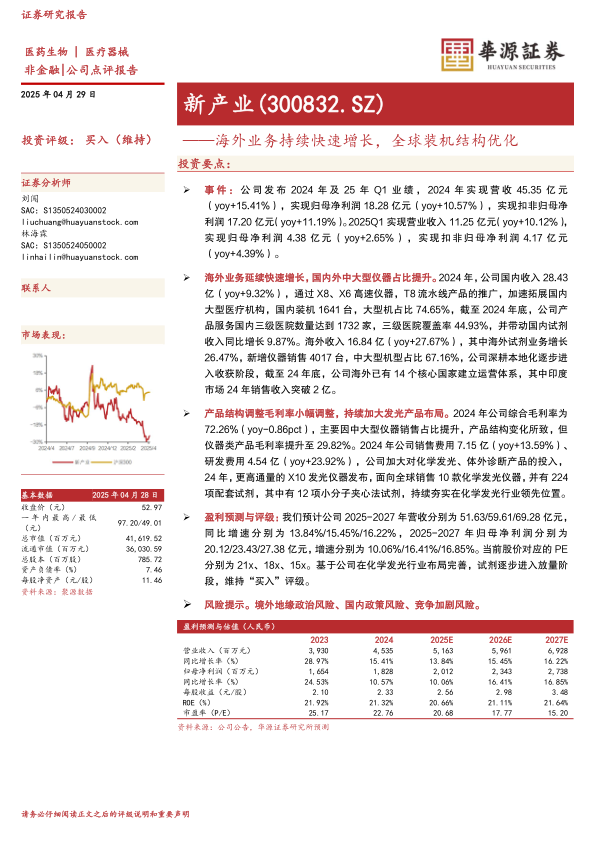 新产业(300832.SZ)在2024年及2025年Q1保持了稳健的增长态势,海外业务的快速扩张和产品结构的持续优化是其主要驱动力。公司通过加大研发投入,不断巩固在化学发光领域的领先地位。尽管面临一定的风险,但基于其良好的发展前景,华源证券维持对新产业“买入”的投资评级。