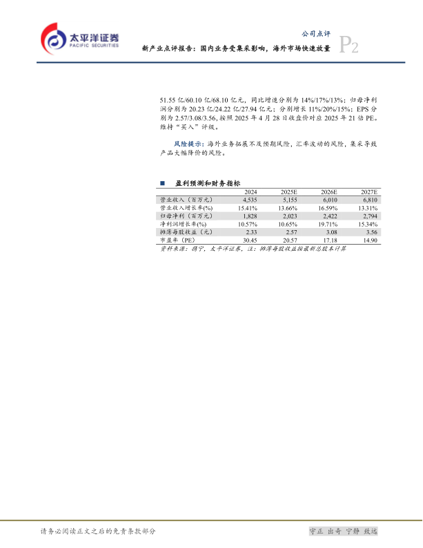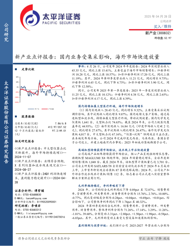 新产业在国内市场面临集采带来的挑战,但通过大客户策略和高端产品保持增长。海外市场成为主要增长引擎,本地化布局和高端产品矩阵推动业绩快速提升。公司积极拓展流水线解决方案,向实验室整体解决方案供应商转型。维持“买入”评级,但需关注相关风险。