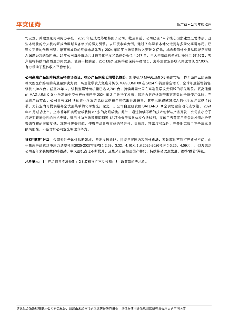 新产业在2024年及25Q1展现出稳健的经营业绩和强劲的发展势头。在国内市场,公司通过大客户策略和高端产品推广,有效应对了集采压力,实现了试剂业务的稳定增长和三级医院覆盖率的提升。在国际市场,公司凭借“区域化运营+本地化深耕”战略,实现了主营业务收入和试剂业务的高速增长,并在多个核心国家建立了运营体系,成功将海外业务推向深度经营阶段。同时,公司持续在高端产品矩阵和技术创新方面发力,旗舰机型MAGLUMI X8装机量持续领先,SATLARS T8流水线表现亮眼,尤其在小分子检测领域取得革命性技术突破,显著增强了核心竞争力。尽管面临集采等政策风险,但公司凭借其强大的市场拓展能力、技术创新实力和“仪器+试剂”协同效应,有望在体外诊断领域持续保持领先地位并实现长期增长。