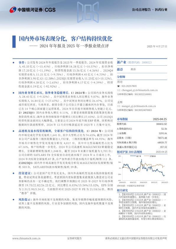 投资建议:公司是国产化学发光龙头,国内外高端机型及流水线持续装机放量,带动试剂业务高速增长。考虑到国内省际联盟集采政策深入推进对公司业务影响仍具有一定不确定性,我们调整并预测公司2025年-2027年归母净利润至19.75/22.82/26.25亿元,同比增长8.03%/15.54%/15.02%,EPS分别为2.51/2.90/3.34元,当前股价对应2025-2027年PE为21/18/16倍,维持“推荐”评级。