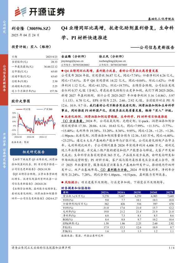 公司发布2024年报,实现营收56.87亿元,同比+7.74%;归母净利润4.26亿元,同比+17.61%。其中Q4实现营收14.22亿元,同比+0.04%、环比-1.62%;归母净利润1.12亿元,同比+41.32%、环比+19.75%,业绩符合预期,公司拟派发现金红利0.37元/股(含税)。考虑抗老化助剂行业竞争加剧,我们下调2025-2026、新增2027年盈利预测,预计公司2025-2027年归母净利润5.16(-0.86)、5.97(-1.13)、6.70亿元,EPS分别为2.25、2.60、2.92元/股,当前股价对应PE为12.6、10.9、9.7倍。我们看好公司不断夯实抗老化剂、润滑油添加剂和生命科学事业,同时推进PI材料国产化,实现多层次高质量发展,维持“买入”评级。