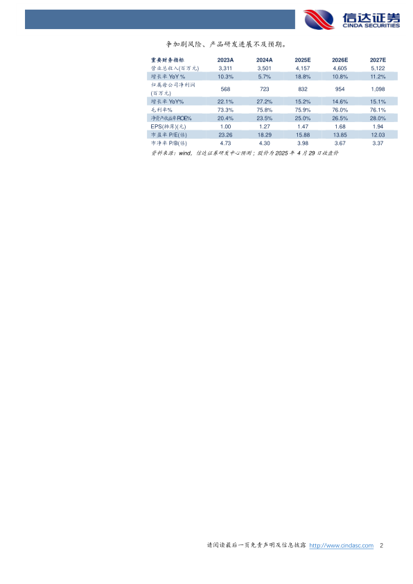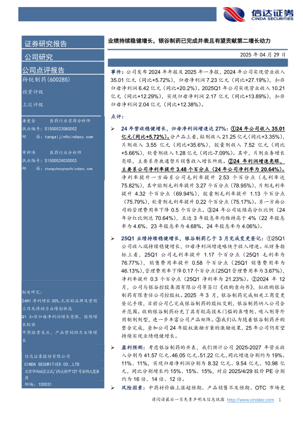 考虑银谷制药的并表,预计公司2025-2027年营业收入分别为41.57亿元、46.05亿元、51.22亿元,同比增速分别约为19%、11%、11%,实现归母净利润分别为8.32亿元、9.54亿元、10.98亿元,同比分别增长约15%、15%、15%,对应2025/4/29股价PE分别约为16倍、14倍、12倍。