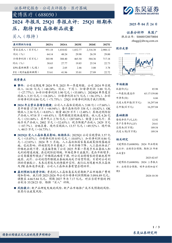 本报告分析了爱博医疗2024年年报及2025年一季度季报,指出公司25Q1业绩受到人工晶体集采政策的影响,短期承压。但报告强调,随着双焦点晶体及PR晶体逐步放量,公司人工晶体业务有望企稳回升,长期增长潜力依然可期。