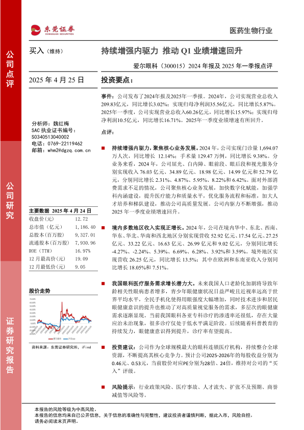 投资建议:公司作为全球规模最大的眼科连锁医疗机构,持续整合全球资源,不断提高其核心竞争力。预计公司2025-2026年的每股收益分别为0.46元、0.53元,当前股价对应PE分别为28倍、24倍,维持对公司的“买入”评级。