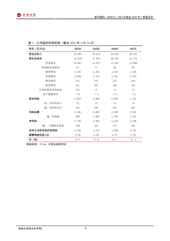 爱尔眼科2024年报及2025年一季报显示,公司通过增强内生动力,实现了业绩的稳健增长。各项核心业务均保持增长态势,尤其境外市场表现亮眼。同时,受益于中国眼科医疗服务需求的巨大潜力,公司作为行业龙头,有望持续整合全球资源,提高核心竞争力。维持“买入”评级,但需关注行业政策、医疗事故等风险。