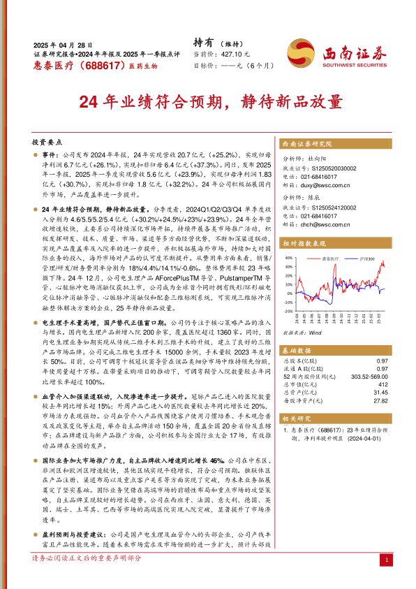 本报告分析了惠泰医疗(688617)2024年年报及2025年一季报,核心观点如下: