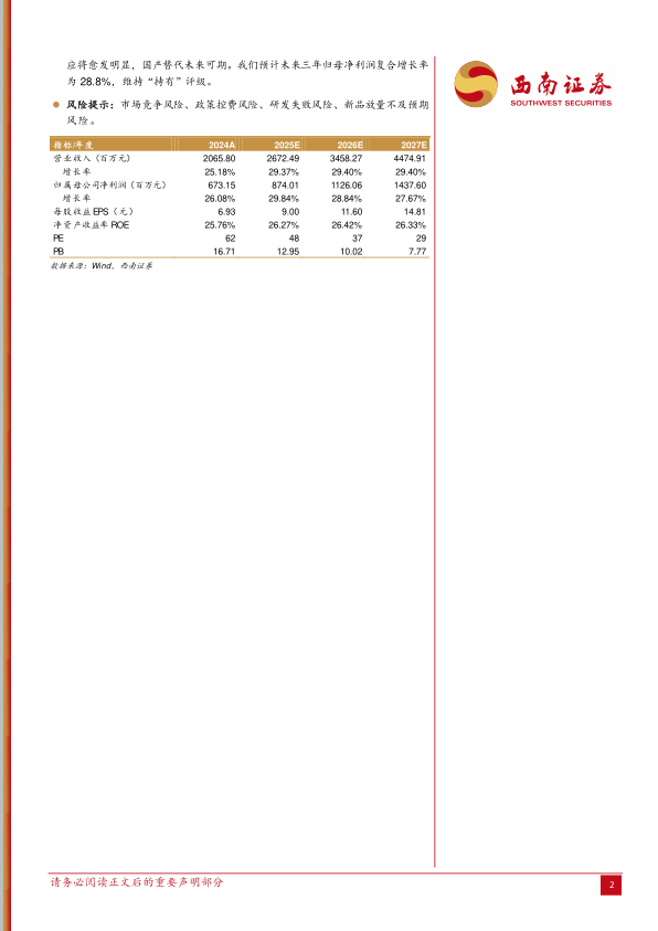 应将愈发明显,国产替代未来可期。我们预计未来三年归母净利润复合增长率为28.8%,维持“持有”评级。