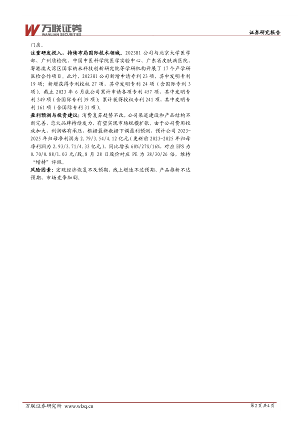 注重研发投入,持续布局国际技术领域。2023H1公司与北京大学医学部、广州质检院、中国中医科学院医学实验中心、广东省皮肤病医院、粤港澳大湾区国家纳米科技创新研究院等学研机构开展了17个产学研医检合作项目。此外,2023H1公司新增申请专利23项,其中发明专利19项;新增获得专利授权27项,其中发明专利24项(含国际专利3项)。截止2023年6月底公司累计申请各项专利457项,其中发明专利349项(含国际专利39项);累计获得授权专利241项,其中发明专利161项(含国际专利31项)。