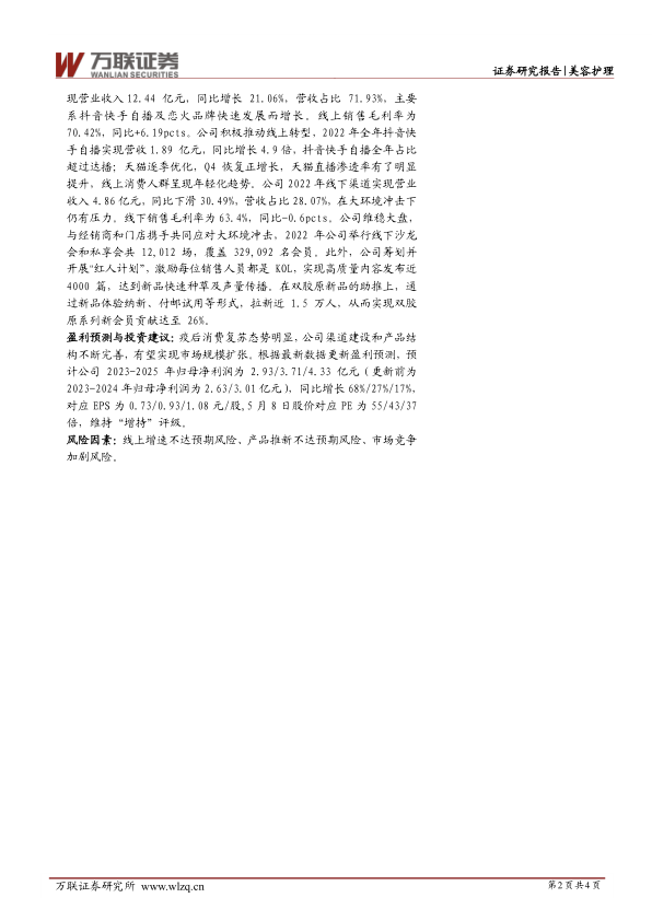 多渠道协同发展,持续加强线上渠道建设。2022年,公司线上渠道实现营业收入12.44亿元,同比增长21.06%,营收占比71.93%,主要系抖音快手自播及恋火品牌快速发展而增长。线上销售毛利率为70.42%,同比+6.19pcts。公司积极推动线上转型,2022年全年抖音快手自播实现营收1.89亿元,同比增长4.9倍,抖音快手自播全年占比超过达播;天猫逐季优化,Q4恢复正增长,天猫直播渗透率有了明显提升,线上消费人群呈现年轻化趋势。公司2022年线下渠道实现营业收入4.86亿元,同比下滑30.49%,营收占比28.07%,在大环境冲击下仍有压力。线下销售毛利率为63.4%,同比-0.6pcts。公司维稳大盘,与经销商和门店携手共同应对大环境冲击,2022年公司举行线下沙龙会和私享会共12,012场,覆盖329,092名会员。此外,公司筹划并开展“红人计划”,激励每位销售人员都是KOL,实现高质量内容发布近4000篇,达到新品快速种草及声量传播。在双胶原新品的助推上,通过新品体验纳新、付邮试用等形式,拉新近1.5万人,从而实现双胶原系列新会员贡献达至26%。