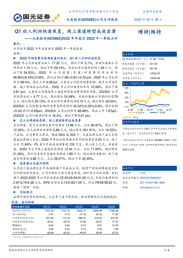本报告对丸美股份2022年年报及2023年一季报进行了深入分析。报告指出,公司在2022年面临盈利压力,但通过优化销售策略和渠道转型,2023年一季度业绩已显著恢复。恋火品牌的高速增长和线上渠道的成功转型是亮点。维持“增持”评级,并对公司未来三年的营收和盈利能力进行了预测。