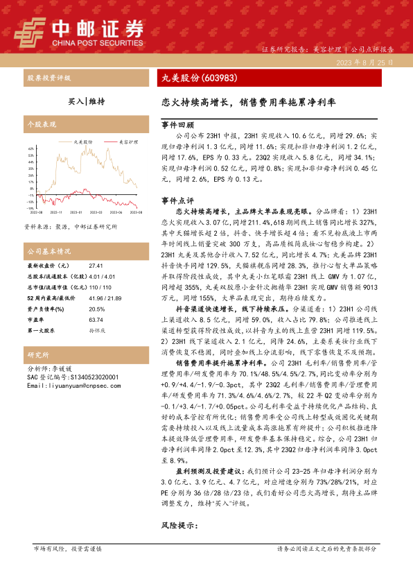 本报告分析了丸美股份2023年中报,指出恋火品牌的高速增长是公司业绩的主要驱动力,主品牌通过大单品策略在线上渠道取得进展,但线下渠道仍面临挑战。同时,销售费用率的提升对净利率产生了一定影响。维持对公司“买入”评级,但需关注新品推广、品牌增长和利润率改善等方面的风险。