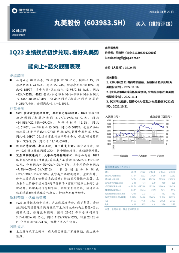 本报告分析了丸美股份2022年及2023年一季度的业绩表现,认为公司一季度业绩拐点初步兑现,产品结构持续优化,线上线下渠道表现良好。维持对公司未来盈利的乐观预测,并维持“买入”评级,但同时也提示了主品牌增长、新品牌推广以及线上竞争等风险。