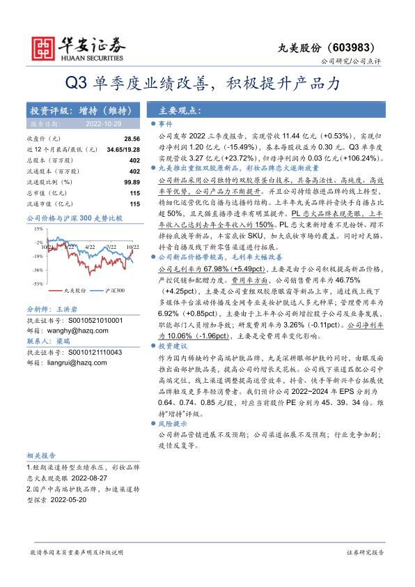 丸美股份Q3单季度业绩改善明显,主要受益于新品推出和渠道拓展。公司通过提升产品力、优化渠道运营,不断提高市场竞争力。华安证券维持“增持”评级,看好公司未来发展潜力。