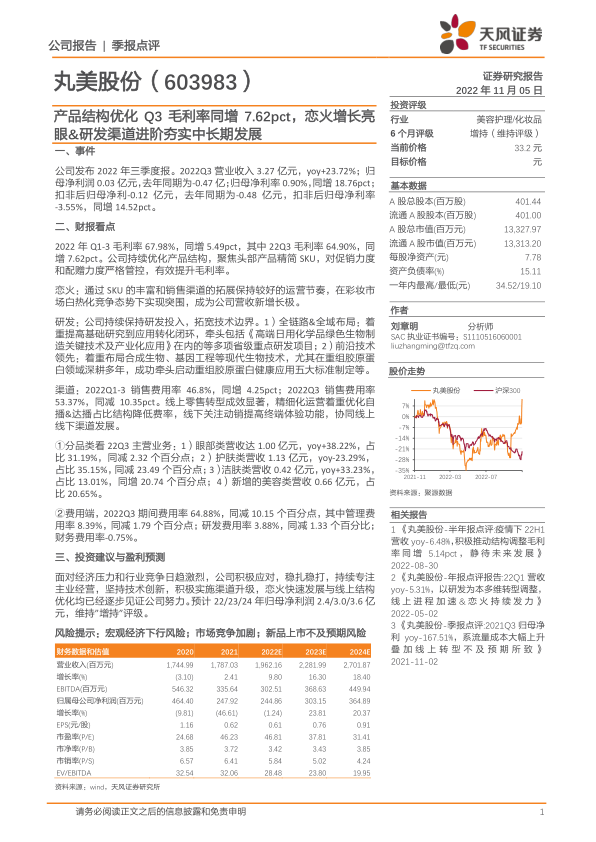 丸美股份2022年第三季度业绩实现显著改善,成功扭亏为盈,主要得益于产品结构优化带来的毛利率提升以及恋火品牌的强劲增长。公司持续在研发和渠道方面进行战略性投入和优化,尤其在重组胶原蛋白等前沿技术领域取得进展,并有效推进线上零售转型和线下体验提升,为中长期发展奠定坚实基础。尽管面临宏观经济和市场竞争压力,公司通过积极的应对策略,预计未来盈利能力将持续增长,维持“增持”评级。