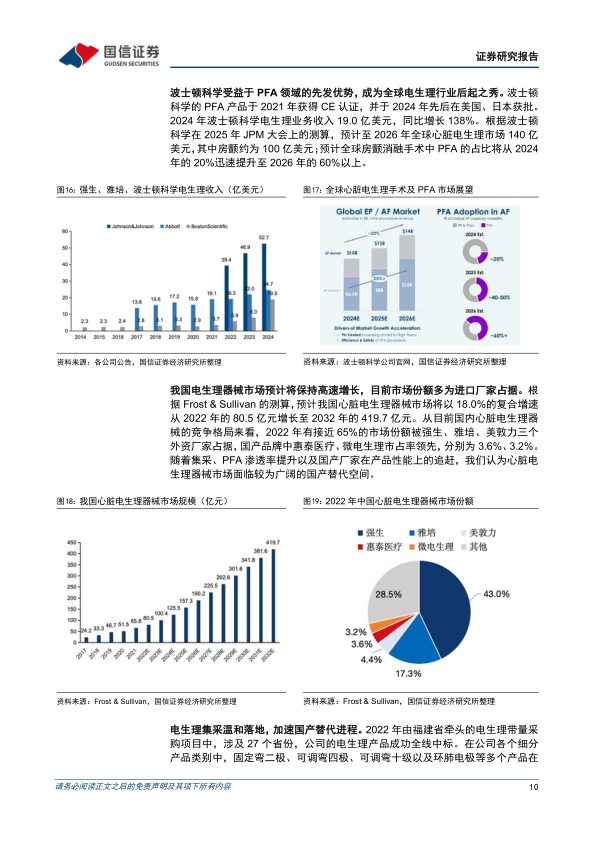 脉冲电场消融(PFA)技术凭借其组织选择性、非热性和瞬时性的特点,在安全性、手术时间、并发症发生率等方面优于传统的射频消融和冷冻消融,有望成为未来电生理手术的主流。波士顿科学的PFA产品于2021年获得CE认证,并于2024年先后在美国、日本获批,其电生理业务收入在2024年达到19.0亿美元,同比增长138%。预计至2026年,全球房颤消融手术中PFA的占比将从2024年的20%迅速提升至60%以上。