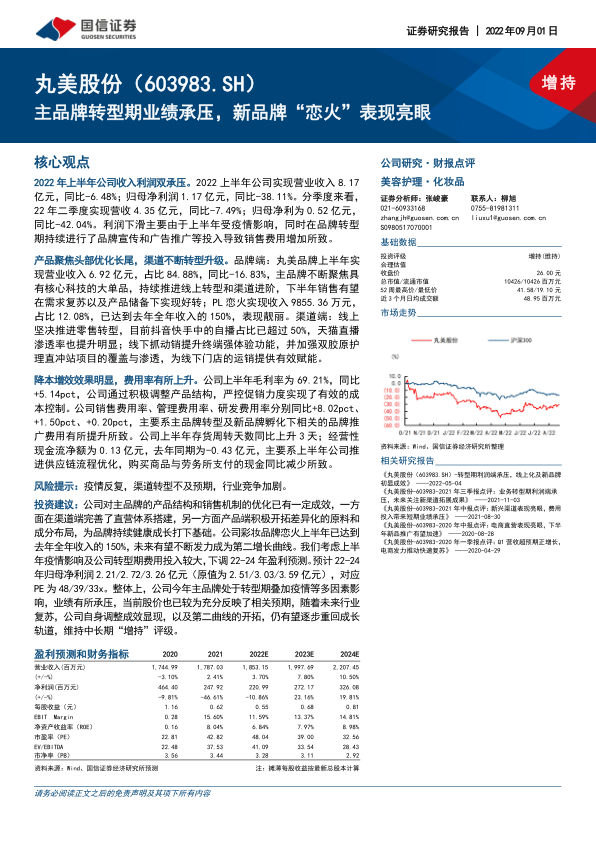 鉴于上半年疫情影响及公司转型期费用投入较大,国信证券经济研究所下调了丸美股份2022-2024年的盈利预测。预计2022-2024年归母净利润分别为2.21亿元、2.72亿元和3.26亿元(原预测值为2.51亿元、3.03亿元和3.59亿元),对应的摊薄每股收益分别为0.55元、0.68元和0.81元。尽管盈利预测有所下调,但分析师认为公司主品牌的产品结构和销售机制优化已初见成效,新品牌“恋火”有望成为第二增长曲线,且公司在渠道端完善了直营体系搭建,产品端积极开拓差异化的原料和成分布局,为中长期持续成长奠定了基础。因此,报告维持对丸美股份的“增持”评级,认为当前股价已较为充分反映了业绩承压预期,随着未来行业复苏、公司自身调整成效显现以及第二增长曲线的开拓,公司仍有望逐步重回成长轨道。