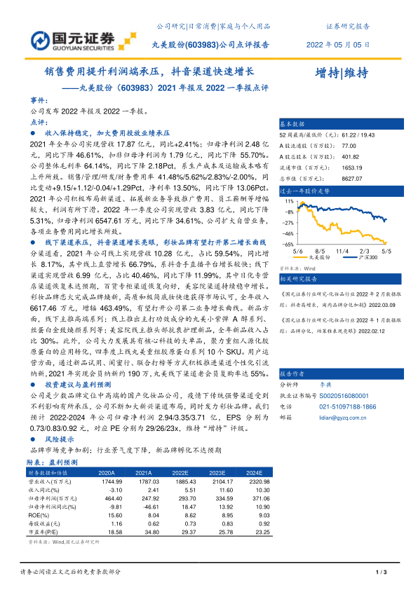 本报告分析了丸美股份2021年年报及2022年一季报,指出公司在营收保持稳定的同时,由于加大费用投放导致利润下滑。线下渠道承压,但抖音渠道增长迅速,彩妆品牌恋火有望成为新的增长点。维持“增持”评级,但需关注市场竞争加剧和新品牌孵化风险。
