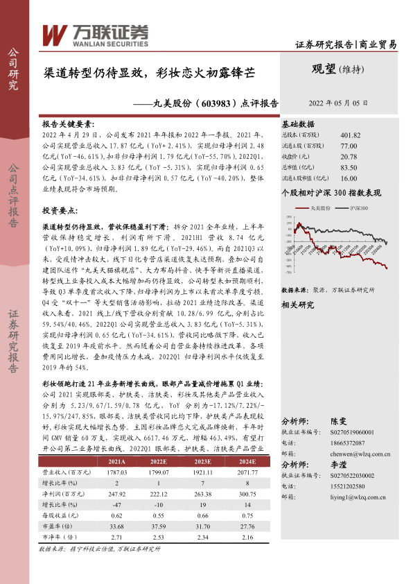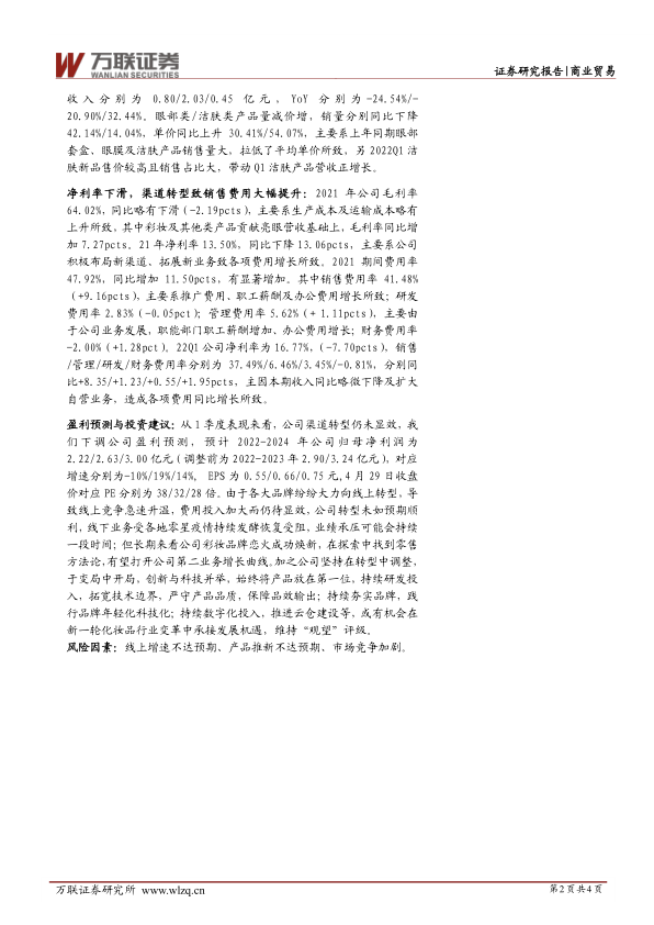 盈利预测与投资建议:从 1 季度表现来看,公司渠道转型仍未显效,我们 下 调 公 司 盈 利 预 测 , 预 计 2022-2024 年 公 司 归 母 净 利 润 为2.22/2.63/3.00 亿元(调整前为 2022-2023 年 2.90/3.24 亿元),对应增速分别为-10%/19%/14%, EPS 为 0.55/0.66/0.75 元,4 月 29 日收盘价对应 PE 分别为 38/32/28 倍。由于各大品牌纷纷大力向线上转型,导致线上竞争急速升温,费用投入加大而仍待显效,公司转型未如预期顺利,线下业务受各地零星疫情持续发酵恢复受阻,业绩承压可能会持续一段时间;但长期来看公司彩妆品牌恋火成功焕新,在探索中找到零售方法论,有望打开公司第二业务增长曲线。加之公司坚持在转型中调整,于变局中开局,创新与科技并举,始终将产品放在第一位,持续研发投入,拓宽技术边界,严守产品品质,保障品效输出;持续夯实品牌,践行品牌年轻化科技化;持续数字化投入,推进云仓建设等,或有机会在新一轮化妆品行业变革中承接发展机遇,维持“观望”评级。