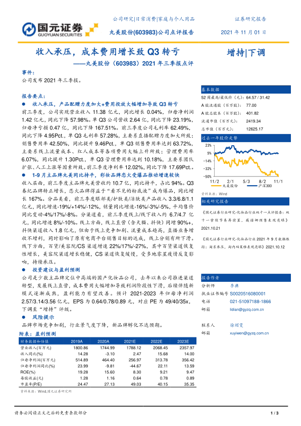 公司是少数主品牌定位中高端的国产化妆品公司,去年以来公司推进渠道转型,发展线上直营,成本费用大幅增加导致利润阶段性下滑,后续伴随新模式逐渐成熟,盈利能力有望改善。预计2021-2023年归母净利润2.57/3.14/3.56亿元,EPS为0.64/0.78/0.89元,对应PE为49/40/35x,下调至“增持”评级。