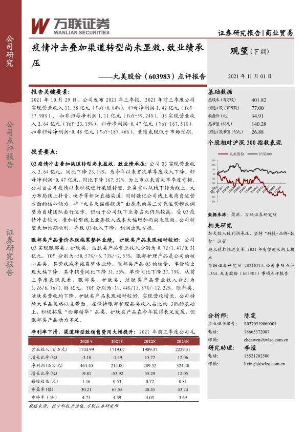 丸美股份在2021年第三季度面临严峻的市场挑战,业绩出现上市以来首次单季度亏损,主要原因在于线下业务受疫情反复冲击严重,而公司为应对市场变化进行的线上渠道转型投入巨大但尚未显现预期成效。作为核心品类的眼部护理产品表现疲软,量价齐跌,严重拖累了整体营收。同时,为拓展线上渠道,销售费用大幅增加,导致公司毛利率和净利率显著下滑,盈利能力受到侵蚀。鉴于当前线上竞争加剧、转型效果不确定以及业绩承压可能持续,分析师已大幅下调公司盈利预测,并将其投资评级调整为“观望”,提示投资者关注线上增速、产品创新及市场竞争等风险因素。