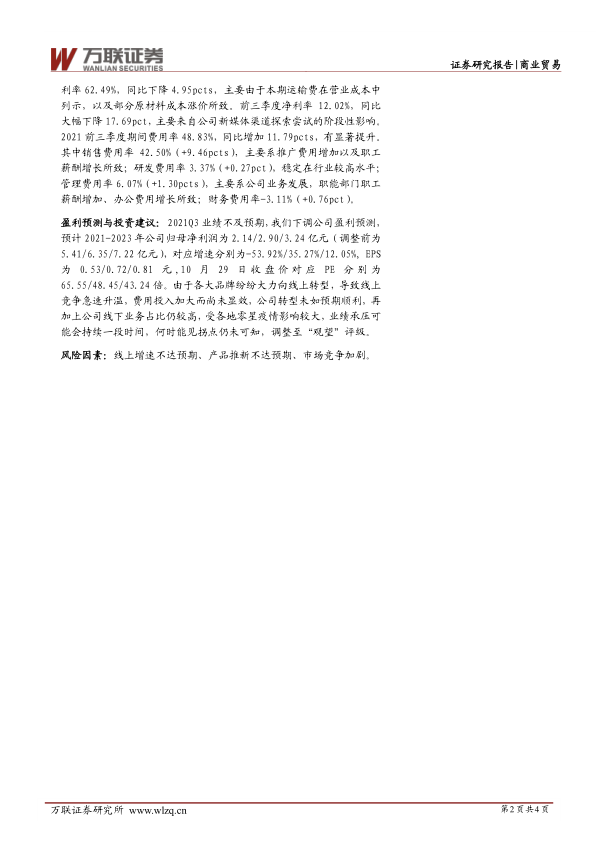 盈利预测与投资建议:2021Q3业绩不及预期,我们下调公司盈利预测,预计2021-2023年公司归母净利润为2.14/2.90/3.24亿元(调整前为5.41/6.35/7.22亿元),对应增速分别为-53.92%/35.27%/12.05%,EPS为0.53/0.72/0.81元,10月29日收盘价对应PE分别为65.55/48.45/43.24倍。由于各大品牌纷纷大力向线上转型,导致线上竞争急速升温,费用投入加大而尚未显效,公司转型未如预期顺利,再加上公司线下业务占比仍较高,受各地零星疫情影响较大,业绩承压可能会持续一段时间,何时能见拐点仍未可知,调整至“观望”评级。