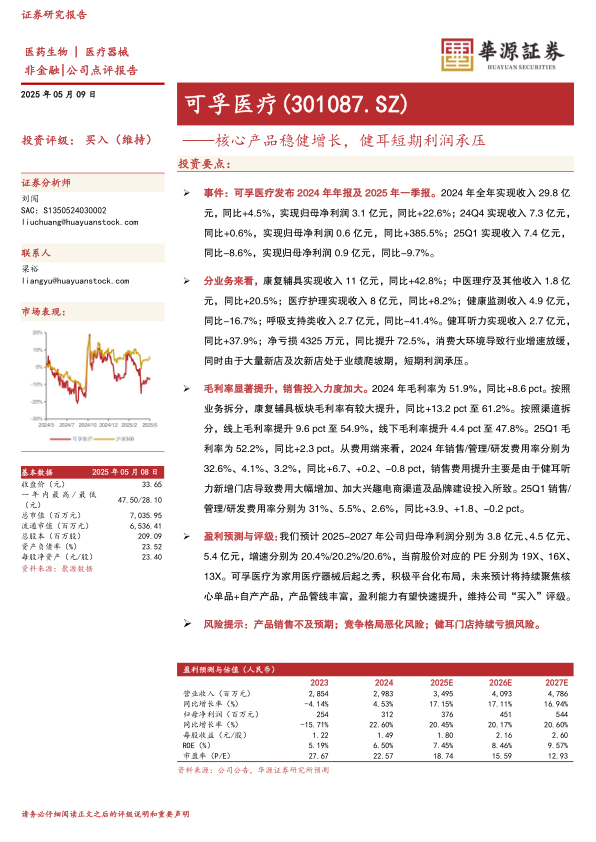 风险提示:产品销售不及预期;竞争格局恶化风险;健耳门店持续亏损风险。