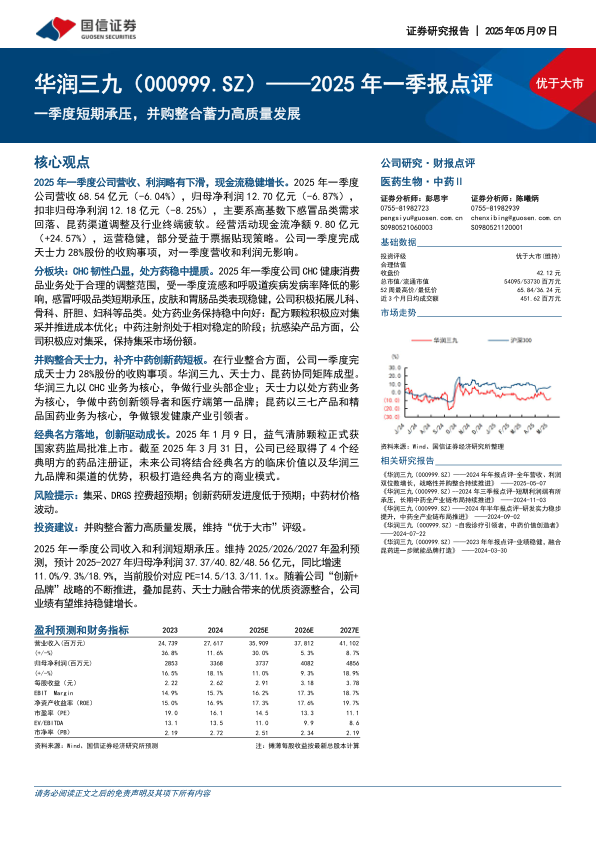 华润三九在2025年第一季度面临营收和利润的短期下滑,主要受高基数效应、渠道调整及行业终端疲软等多重因素影响。然而,公司经营活动现金流保持稳健增长,显示出良好的运营韧性。在战略层面,华润三九积极推进并购整合,成功收购天士力部分股权,构建了华润三九、天士力、昆药三方协同矩阵,明确了各方在CHC、中药创新和银发健康产业的战略定位,旨在补齐中药创新药短板并实现高质量发展。同时,益气清肺颗粒等经典名方的获批上市,彰显了公司在创新驱动方面的持续努力。尽管短期承压,但凭借“创新+品牌”战略的深入实施以及并购整合带来的协同效应,公司未来业绩有望保持稳健增长,因此维持“优于大市”的投资评级。