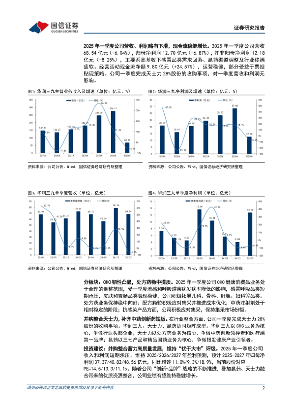 2025年一季度公司收入和利润短期承压。维持2025/2026/2027年盈利预测,预计2025-2027年归母净利润37.37/40.82/48.56亿元,同比增速11.0%/9.3%/18.9%,当前股价对应PE=14.5/13.3/11.1x。随着公司“创新+品牌”战略的不断推进,叠加昆药、天士力融合带来的优质资源整合,公司业绩有望维持稳健增长。