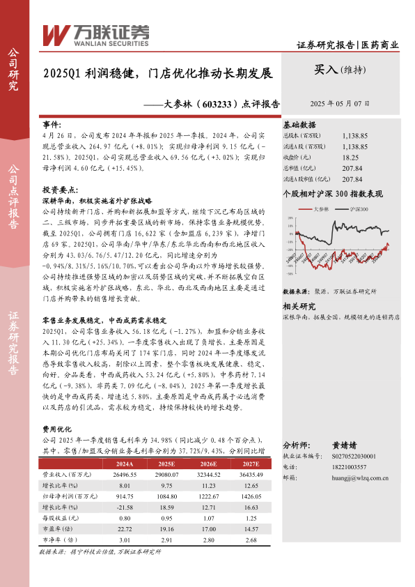 本报告对大参林(603233)2025年一季度业绩进行了分析,并维持“买入”评级。