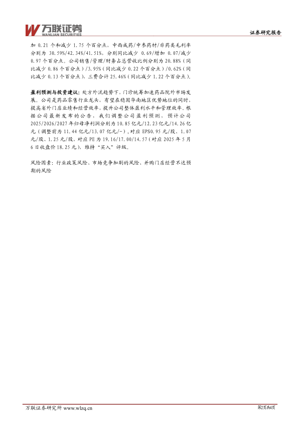 盈利预测与投资建议:处方外流趋势下,门诊统筹加速药品院外市场发展。公司是药品零售行业龙头,有望在稳固华南地区优势地位的同时,提高省外门店业绩和经营效率,提升公司整体盈利水平和管理效率。根据公司最新发布的公告,我们调整公司盈利预测,预计公司2025/2026/2027年归母净利润分别为10.85亿元/12.23亿元/14.26亿元(调整前为11.44亿元/13.07亿元/-),对应EPS0.95元/股、1.07元/股、1.25元/股,对应PE为19.16/17.00/14.57(对应2025年5月6日收盘价18.25元),维持“买入”评级。