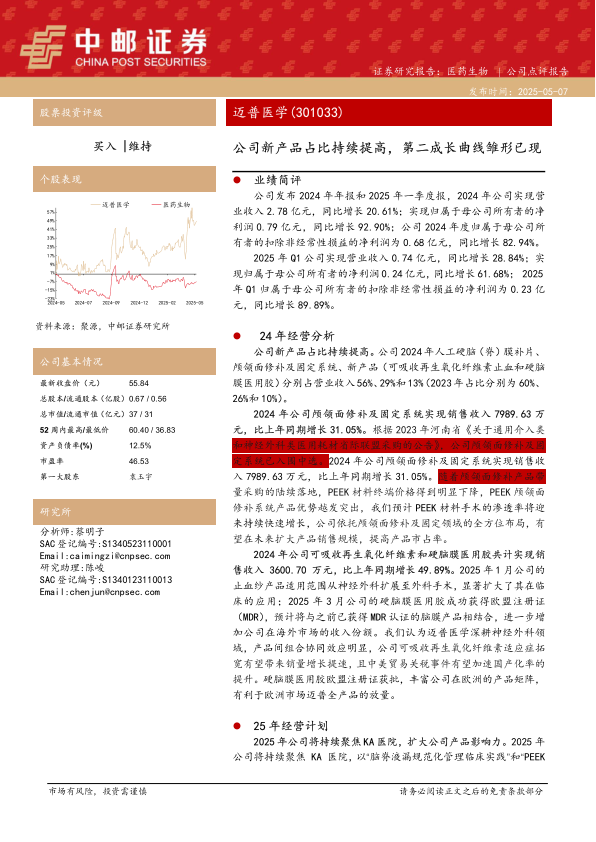 本报告分析了迈普医学(301033)2024年年报和2025年一季度报,指出公司新产品(如可吸收再生氧化纤维素止血和硬脑膜医用胶)的营收占比持续提高,推动了公司整体营收和利润的显著增长。