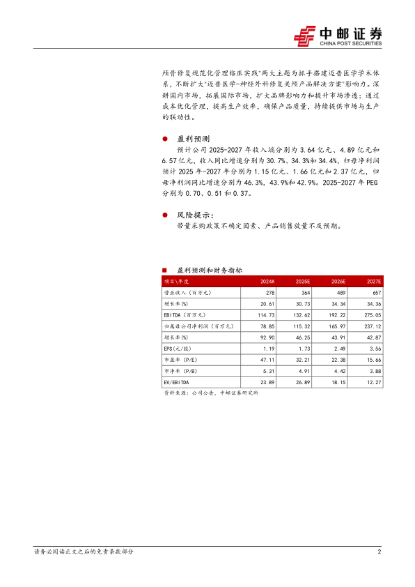 2025年公司将持续聚焦KA医院,扩大公司产品影响力。2025年公司将持续聚焦KA医院,以“脑脊液漏规范化管理临床实践”和“PEEK颅骨修复规范化管理临床实践”两大主题为抓手搭建迈普医学学术体系,不断扩大“迈普医学-神经外科修复关颅产品解决方案”影响力。深耕国内市场,拓展国际市场,扩大品牌影响力和提升市场渗透;通过成本优化管理,提高生产效率,确保产品质量,持续提供市场与生产的联动性。