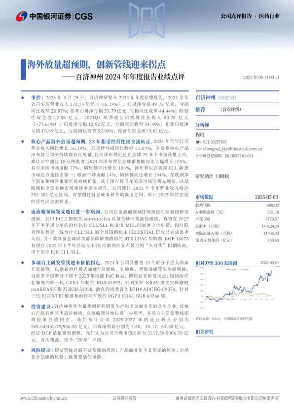 事件:2025年4月29日,百济神州发布2024年年度业绩报告,2024全年公司实现营业收入272.14亿元(+56.19%);归母净亏损49.78亿元,亏损同比收窄25.87%;扣非归母净亏损53.79亿元,亏损同比收窄44.44%; 经营性现金流-12.59亿元。2024Q4单季度公司实现营业收入80.78亿元(+77.61%);归母净亏损12.92亿元,亏损同比收窄54.49%;扣非归母净亏损13.89亿元,亏损同比收窄52.08%; 经营性现金流+5.82亿元。