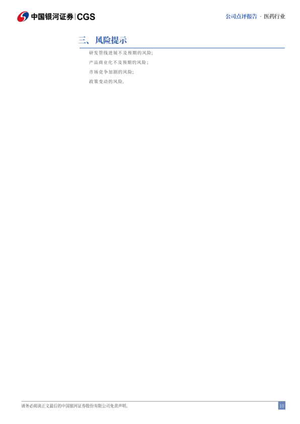 风险提示:研发管线进展不及预期的风险;产品商业化不及预期的风险;市场竞争加剧的风险:政策变动的风险