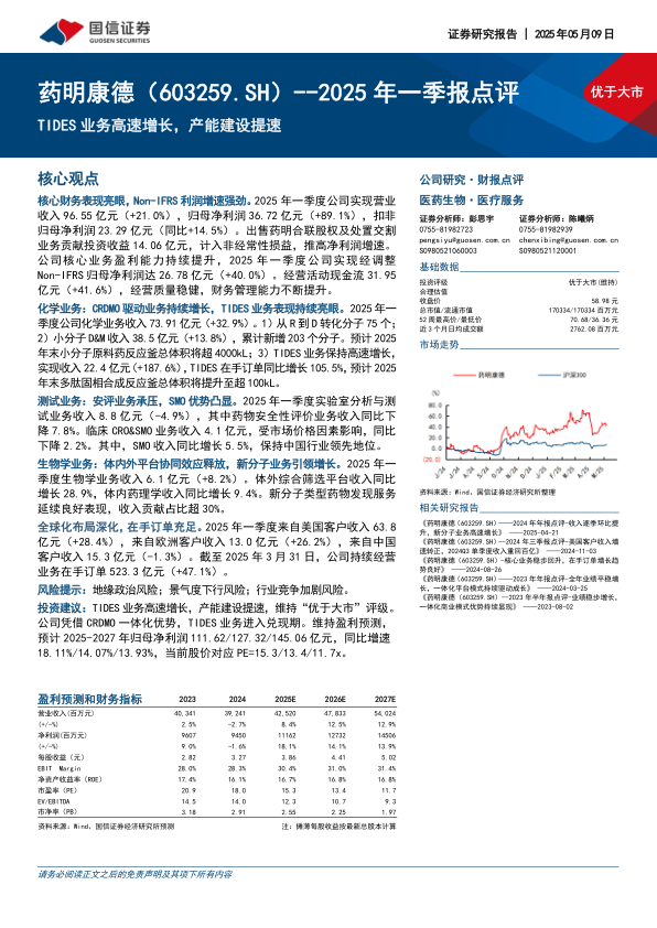 投资建议:TIDES业务高速增长,产能建设提速,维持“优于大市”评级。公司凭借CRDMO一体化优势,TIDES业务进入兑现期。维持盈利预测,预计2025-2027年归母净利润111.62/127.32/145.06亿元,同比增速18.11%/14.07%/13.93%,当前股价对应PE=15.3/13.4/11.7x。