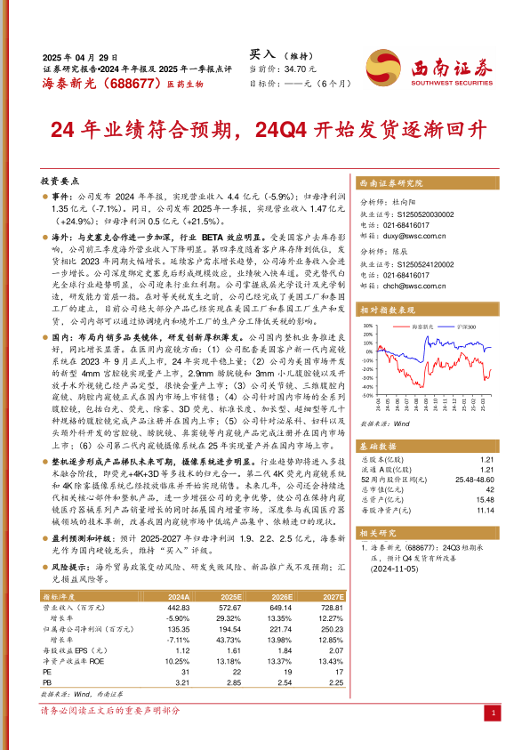 本报告分析了海泰新光(688677)2024年年报及2025年一季报,并维持“买入”评级。