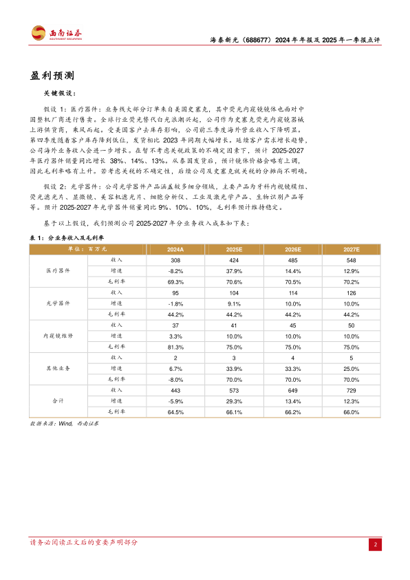 盈利预测和评级:预计2025-2027年归母净利润1.9、2.2、2.5亿元,海泰新光作为国内硬镜龙头,维持“买入”评级。
