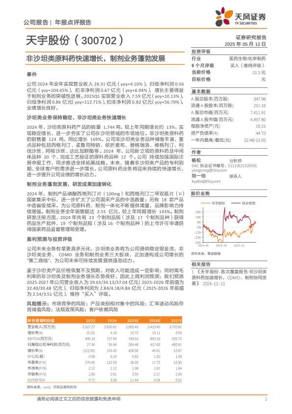 鉴于沙坦类产品价格恢复不及预期,对收入可能造成一定影响;同时高毛利率的非沙坦类及制剂业务增长态势良好,因此上调利润预测:我们预测2025-2027年公司营业收入为29.65/34.13/37.04亿元(2025-2026年前值为32.40/39.48亿元),归母净利润为2.84/4.18/4.84亿元(2025-2026年前值为2.54/3.51亿元),维持“买入”评级。