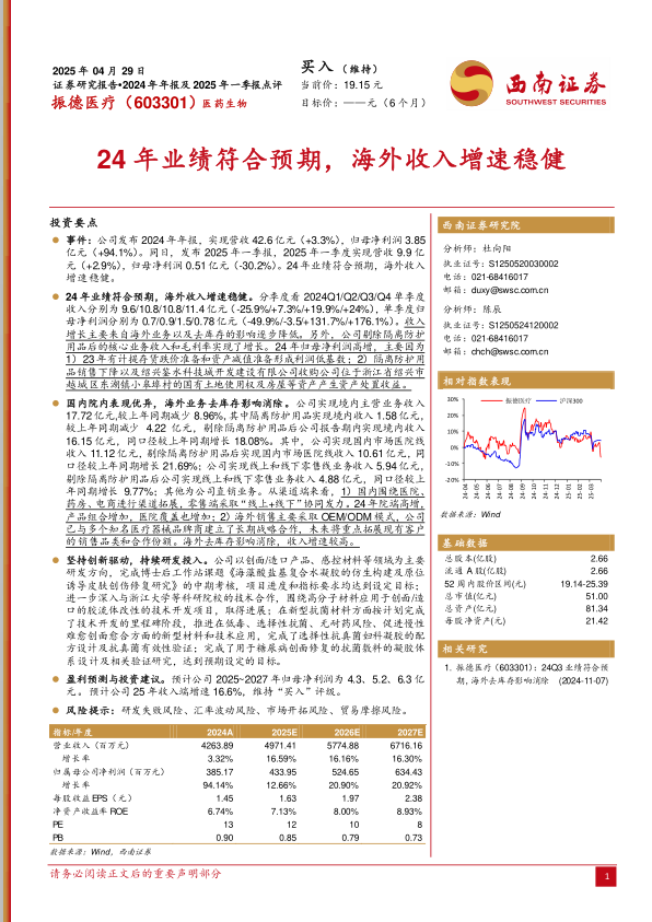 事件:公司发布2024年年报,实现营收42.6亿元(+3.3%),归母净利润3.85亿元(+94.1%)。同日,发布2025年一季报,2025年一季度实现营收9.9亿元(+2.9%),归母净利润0.51亿元(-30.2%)。24年业绩符合预期,海外收入增速稳健。