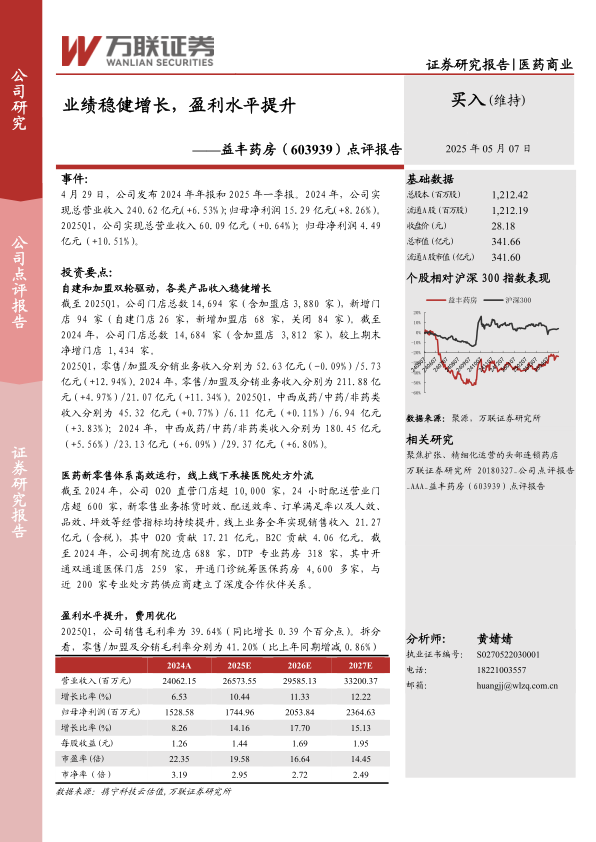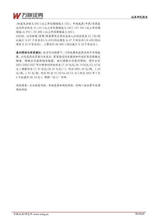 盈利预测与投资建议:处方外流趋势下,门诊统筹加速药品院外市场发展。公司是药品零售行业龙头,有望通过内生提效和外延扩张实现做大做强。根据公司最新报告披露,我们调整公司盈利预测,预计公司2025/2026/2027年归母净利润分别为17.45亿元/20.54亿元/23.65亿元(调整前为17.45亿元/20.01亿元/-),对应EPS1.44元/股、1.69元/股、1.95元/股,对应PE为19.58/16.64/14.45(对应2025年5月6日收盘价28.18元),维持“买入”评级。