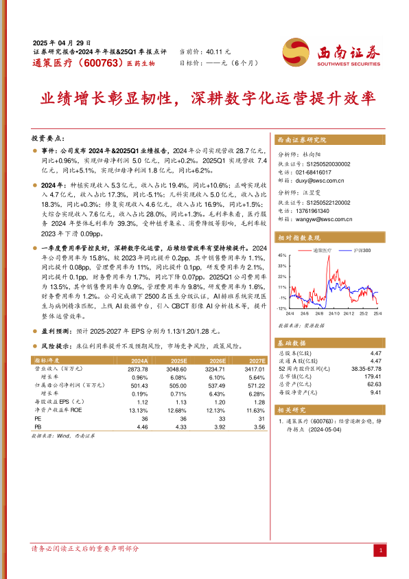 本报告分析了通策医疗2024年及2025年第一季度的业绩表现,指出公司在营收和利润方面均实现了增长,展现出较强的经营韧性。公司通过深耕数字化运营,有效提升了运营效率。报告还对公司未来几年的盈利情况进行了预测,并提出了相关的风险提示。