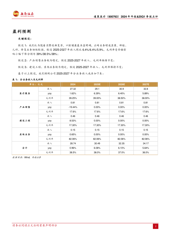 2024年:种植实现收入5.3亿元,收入占比19.4%,同比+10.6%;正畸实现收入4.7亿元,收入占比17.3%,同比-5.1%;儿科实现收入5.0亿元,收入占比18.3%,同比+0.3%;修复实现收入4.6亿元,收入占比16.9%,同比+1.5%;大综合实现收入7.6亿元,收入占比28.0%,同比+1.3%。毛利率来看,医疗服务2024年整体毛利率为39.3%,受种植牙集采、消费降级等影响,毛利率较2023年下滑0.09pp。