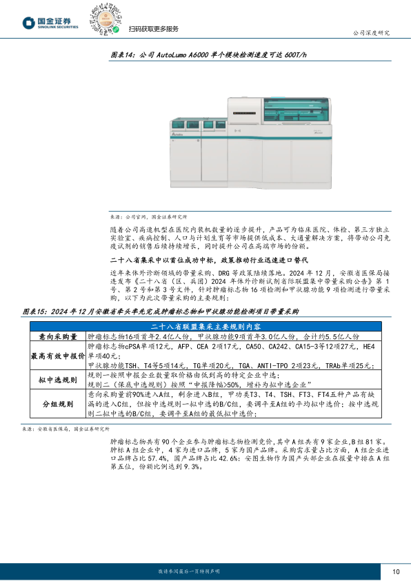 集采推动行业变革,发光高速机推广带来份额提升。公司作为国内体外诊断行业领军企业,试剂产品以免疫诊断为主。2024年安徽省牵头二十八省体外诊断试剂集采中,公司产品采购需求量情况良好且最终以第一次序中标,集采执行后将加速国产化进程。在高端产品方面,公司高通量化学发光免疫分析仪AutoLumoA6000单个分析模块检测速度600T/h,随着高速机型在医院内装机逐步取得成果,将带动公司免疫试剂在高端市场份额快速提升。