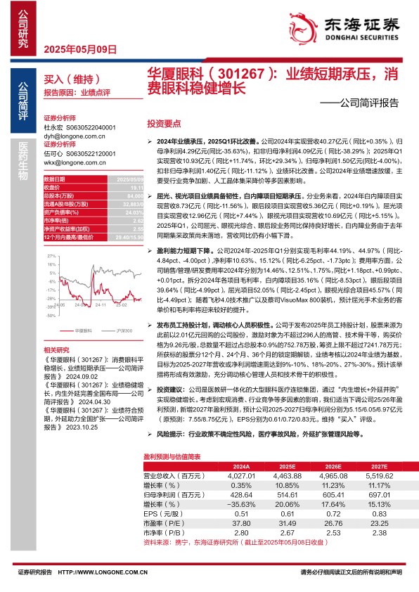 本报告分析了华厦眼科2024年的业绩表现,指出公司业绩受到行业竞争和集采政策的影响,短期承压。但屈光、视光等消费眼科业务表现出较强的韧性,且公司通过员工持股计划等措施激励核心人员,长期来看仍具备增长潜力。报告下调了公司未来两年的盈利预测,但维持“买入”评级,认为公司在眼科医疗连锁领域仍具有投资价值。