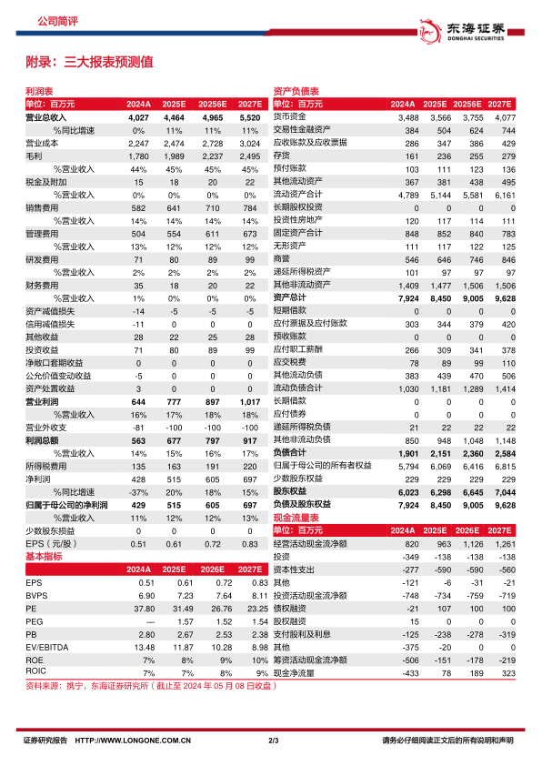 发布员工持股计划,调动核心人员积极性。公司于发布2025年员工持股计划,股票来源为此前以2.01亿元回购的公司股份,激励对象为不超过296人的高管、技术骨干等,购买价格为9.26元/股,总数量不超过占总股本0.9%的752.78万股,筹资上限不超过7241.78万元;所获标的股票分12个月、24个月、36个月的锁定期解锁,业绩考核以2024年业绩为基数,目标为2025-2027年营收或净利润增速需达到9%-10%、18%-20%、27%-30%。预计该举措将形成有效激励,充分调动核心管理人员和技术骨干的积极性。