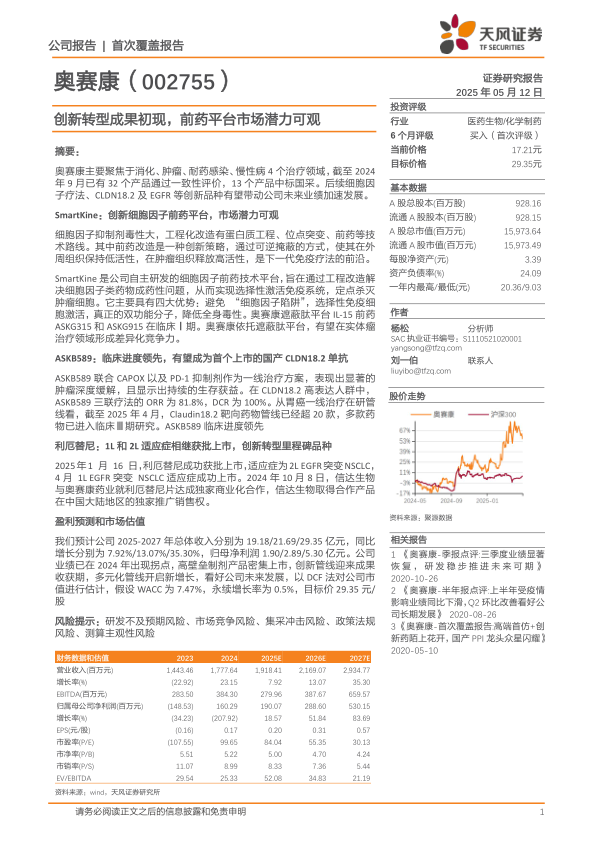 我们预计公司2025-2027年总体收入分别为19.18/21.69/29.35亿元,同比增长分别为7.92%/13.07%/35.30%,归母净利润1.90/2.89/5.30亿元。公司业绩已在2024年出现拐点,高壁垒制剂产品密集上市,创新管线迎来成果收获期,多元化管线开启新增长,看好公司未来发展,以DCF法对公司市值进行估计,假设WACC为7.47%,永续增长率为0.5%,目标价29.35元/股
