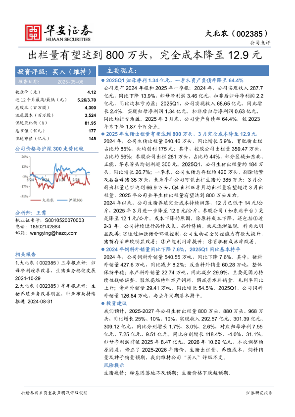 本报告分析了大北农2024年及2025年一季度的业绩表现,重点分析了其生猪业务的出栏量增长和成本控制情况,并对饲料业务进行了梳理。报告认为,公司通过品种改良、加强生物安全防控等措施有效降低了养殖成本,提升了盈利能力。基于对公司未来出栏量的预测,维持“买入”评级。同时,报告也提示了生猪疫情、转基因落地以及猪价下跌等风险。